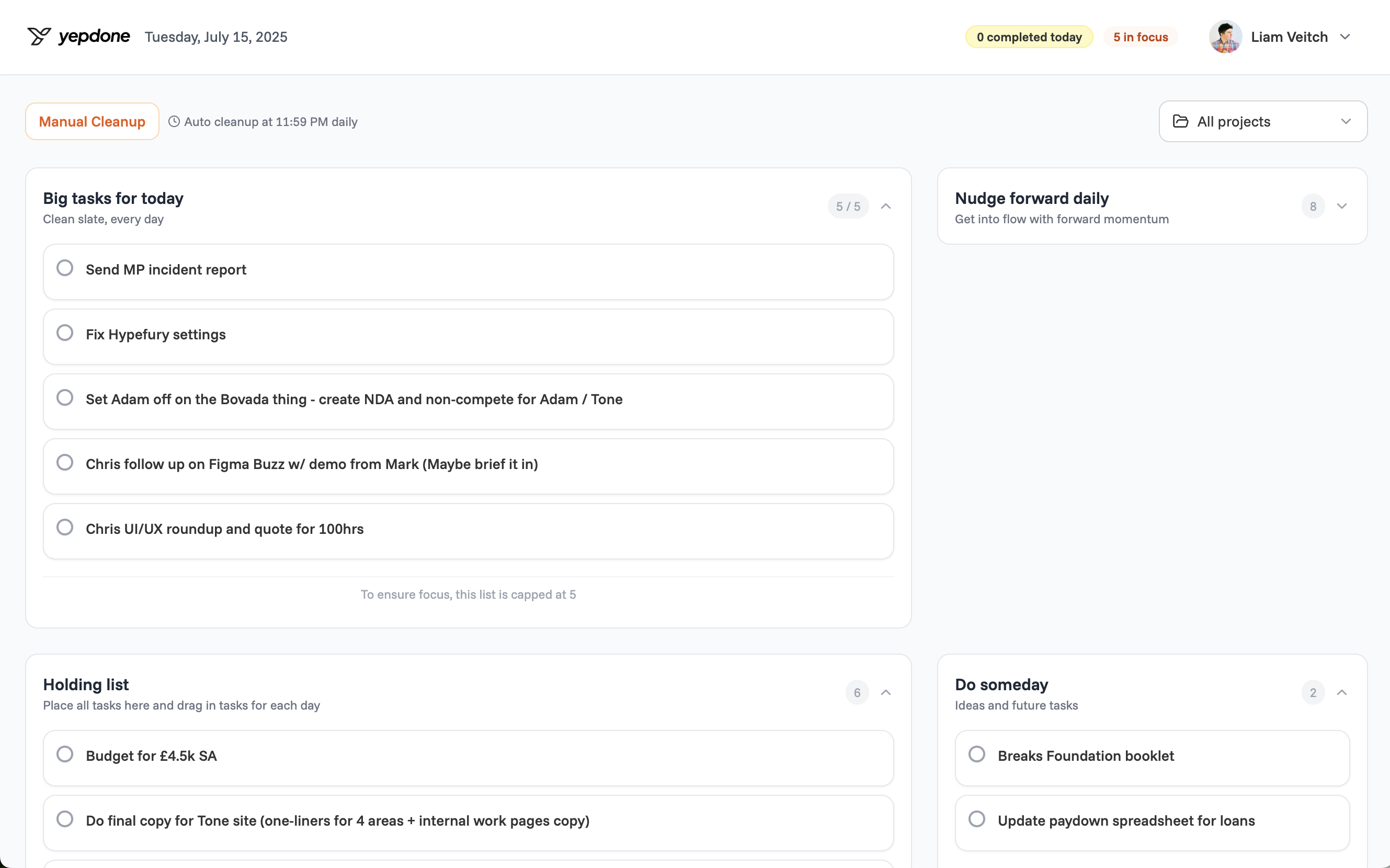 Start a clean slate every day with 5 big tasks and projects to move forward.